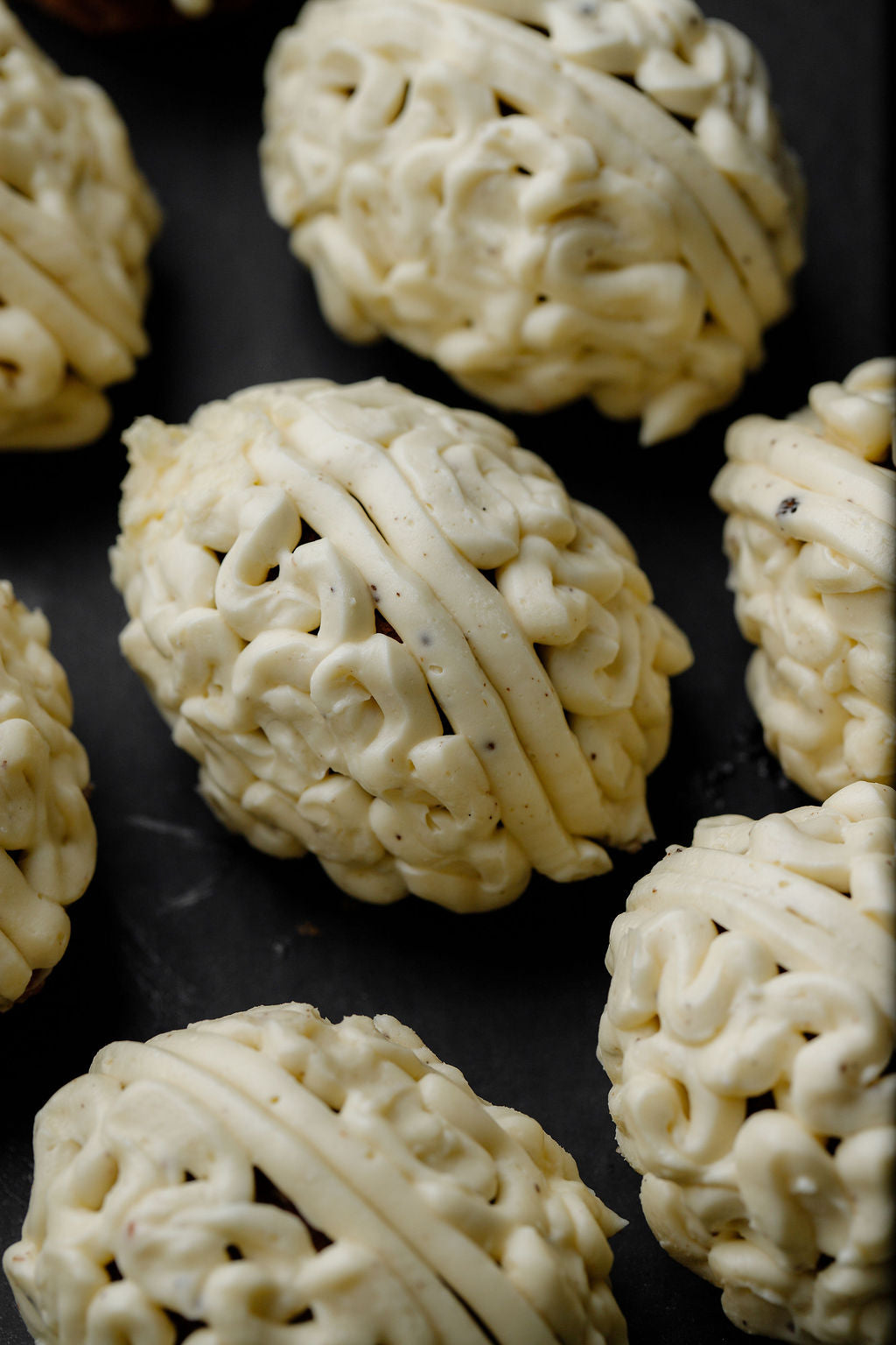 Description: Fudgy chocolate brownie filled with hazelnut pieces and topped with a swirl of vanilla “brain” icing.
